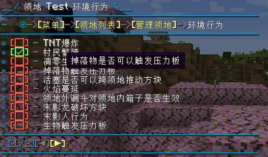 领地环境行为主要指的是一些与玩家无直接关联的事件,例如苦力怕爆炸、火焰蔓延、特定生物的生成等。 通过关闭相关的行为可以避免一些非人为情况对领地造成破坏。