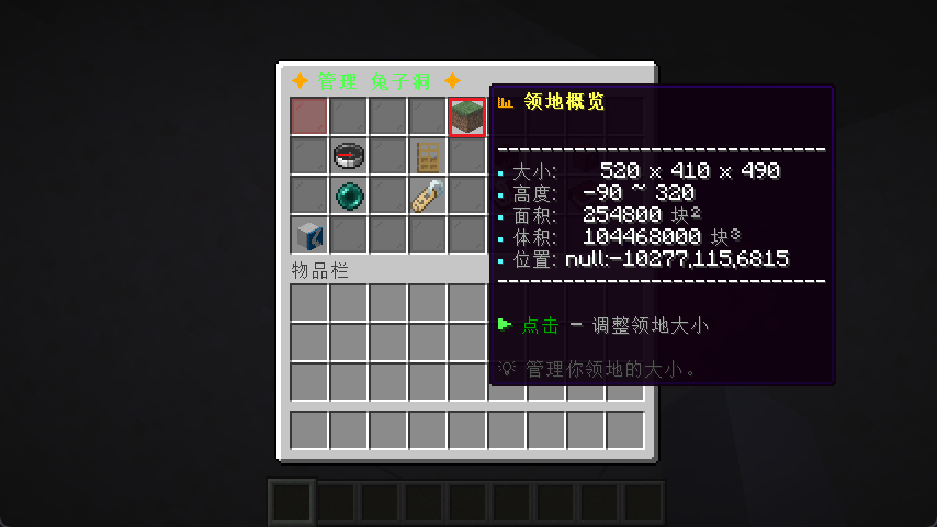 打开对应领地的管理页面,鼠标移动到领地概览,可以查看当前领地的尺寸信息: