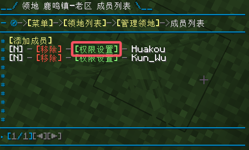 在成员列表点击对应成员前的【权限设置】即可配置此成员在领地内的权限: